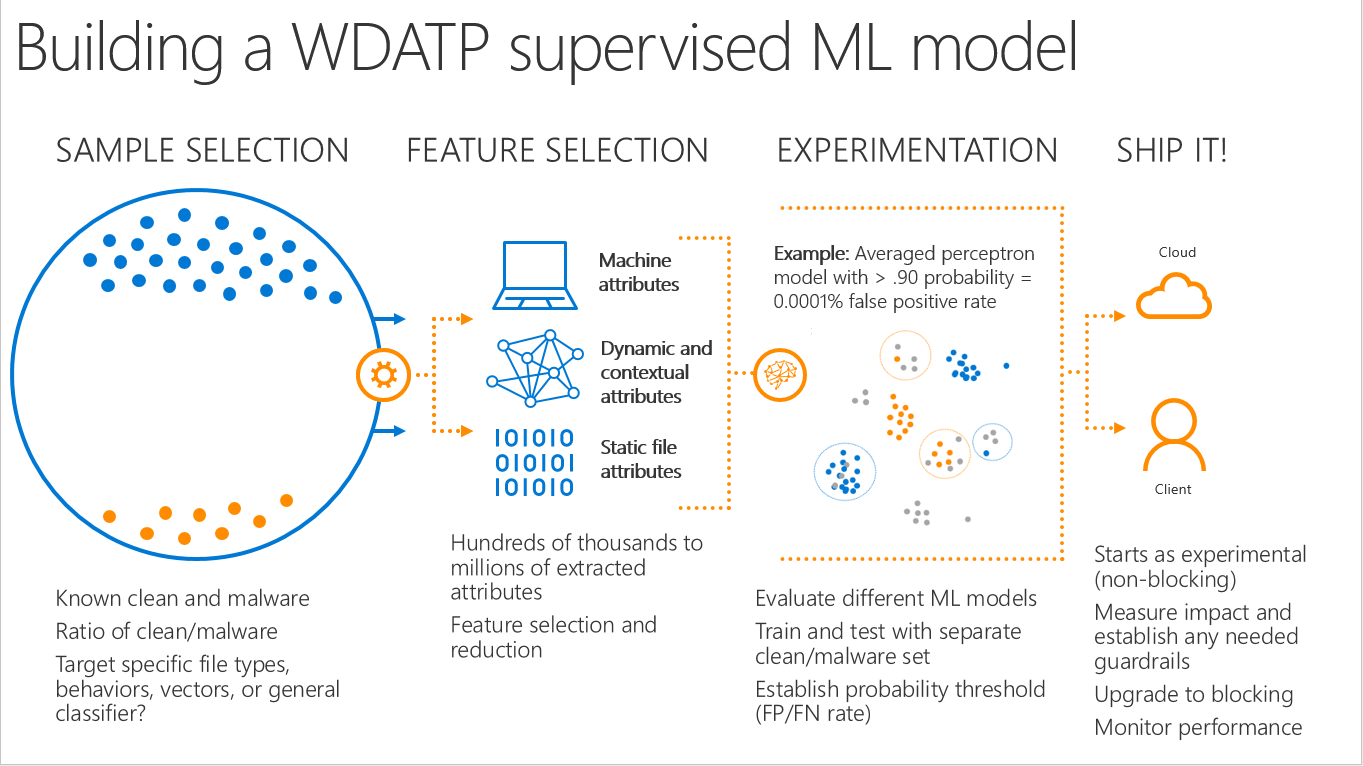 Microsoft Defender ATP has a variety of models to serve multiple purposes. For instance, they have models that focus on first seen PE threats, macro threats, and script-based attacks. There are also models that are focused on the underlying data; for example, some models train exclusively on fuzzy hashes of files. On top of these, they have another layer of ensemble models that take signals from these individual classifiers to check once again if the system activity is malicious.