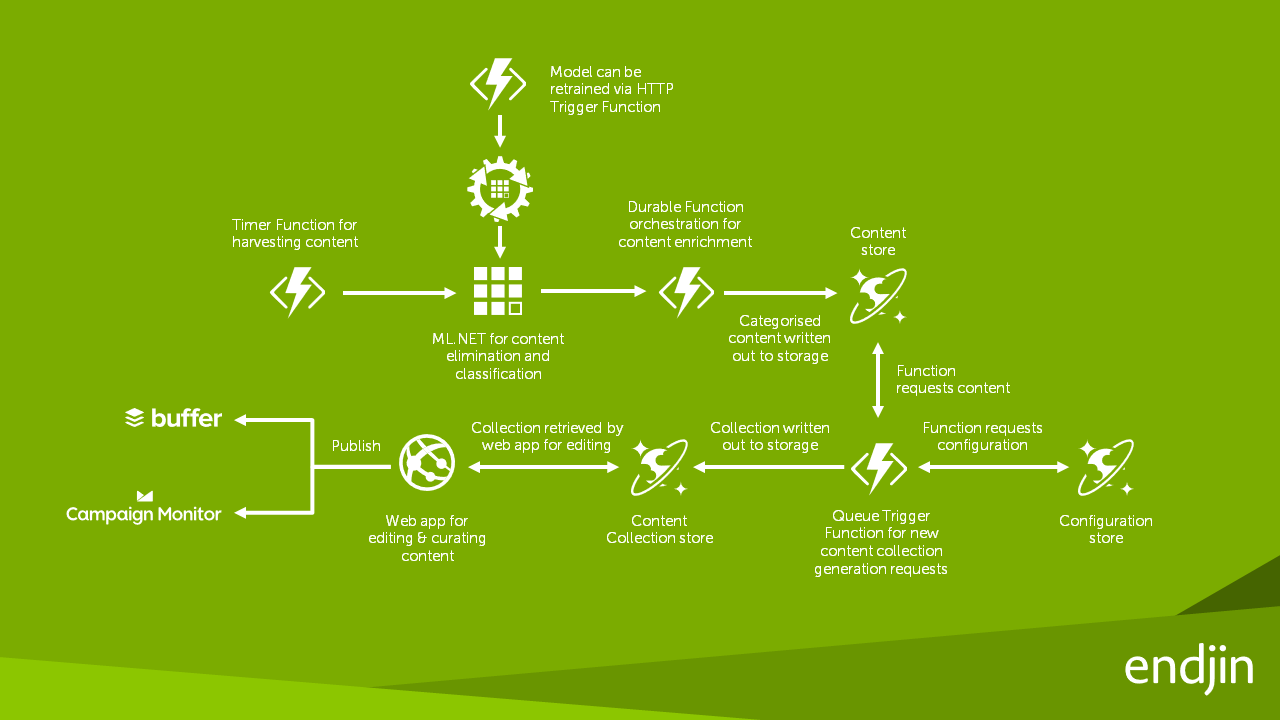 Once endjin had the trained ML.NET models generated by AutoML, they integrated the models into the existing content platform, simply swapping out the existing custom classification algorithms. The ML.NET models were hosted inside an Azure Function to enable elastic scale of model evaluation. A new Durable Function was used to allow the models to be retrained on demand.