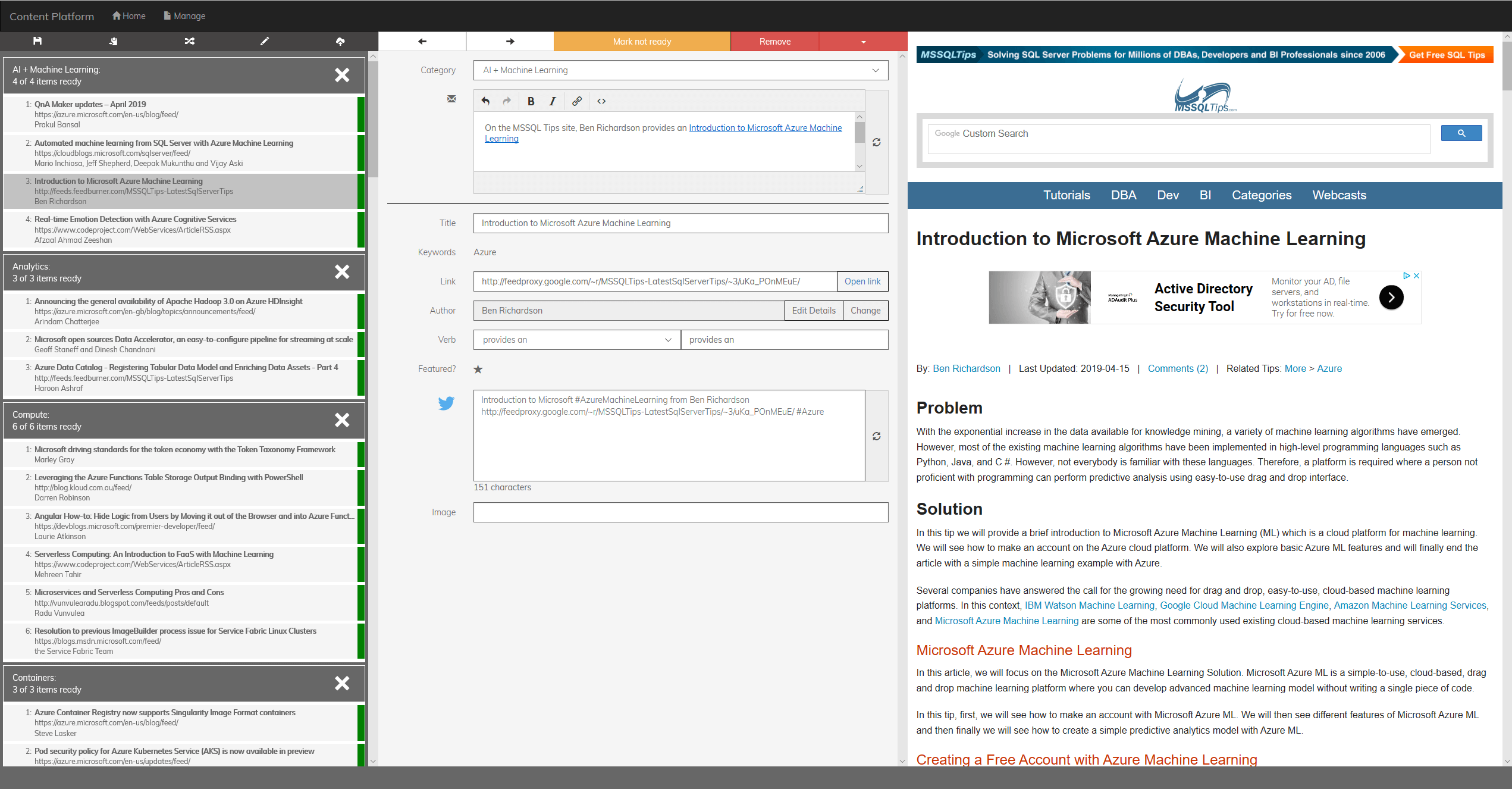 In 2014, endjin created Azure Weekly, a free newsletter that summarizes the week's top news in the Azure ecosystem. For the first 25 issues, the team at endjin manually curated the newsletter, but as the volume of content grew, they realized this was unsustainable. They applied their company mantra of "work smarter" and automated the end-to-end process by creating their own custom C# text classifier to classify articles from over 300 blogs into 19 categories, including AI + Machine Learning, Analytics, DevOps, Internet of Things, Networking, and Web. This worked relatively well, but in addition to the requirement of keeping an active list of keywords to classify against, manual corrections were needed every week, which caused major maintenance overhead.
